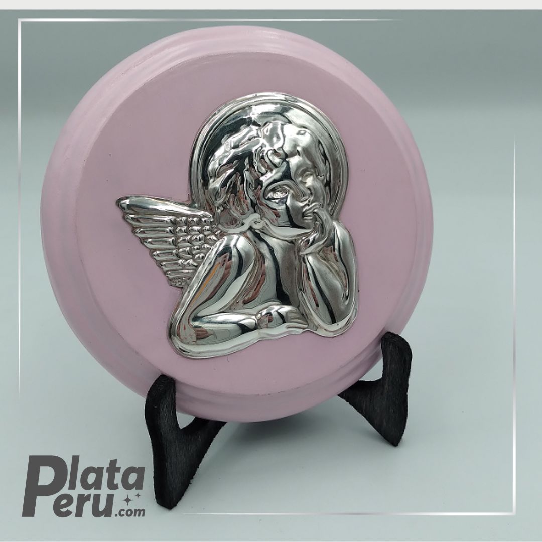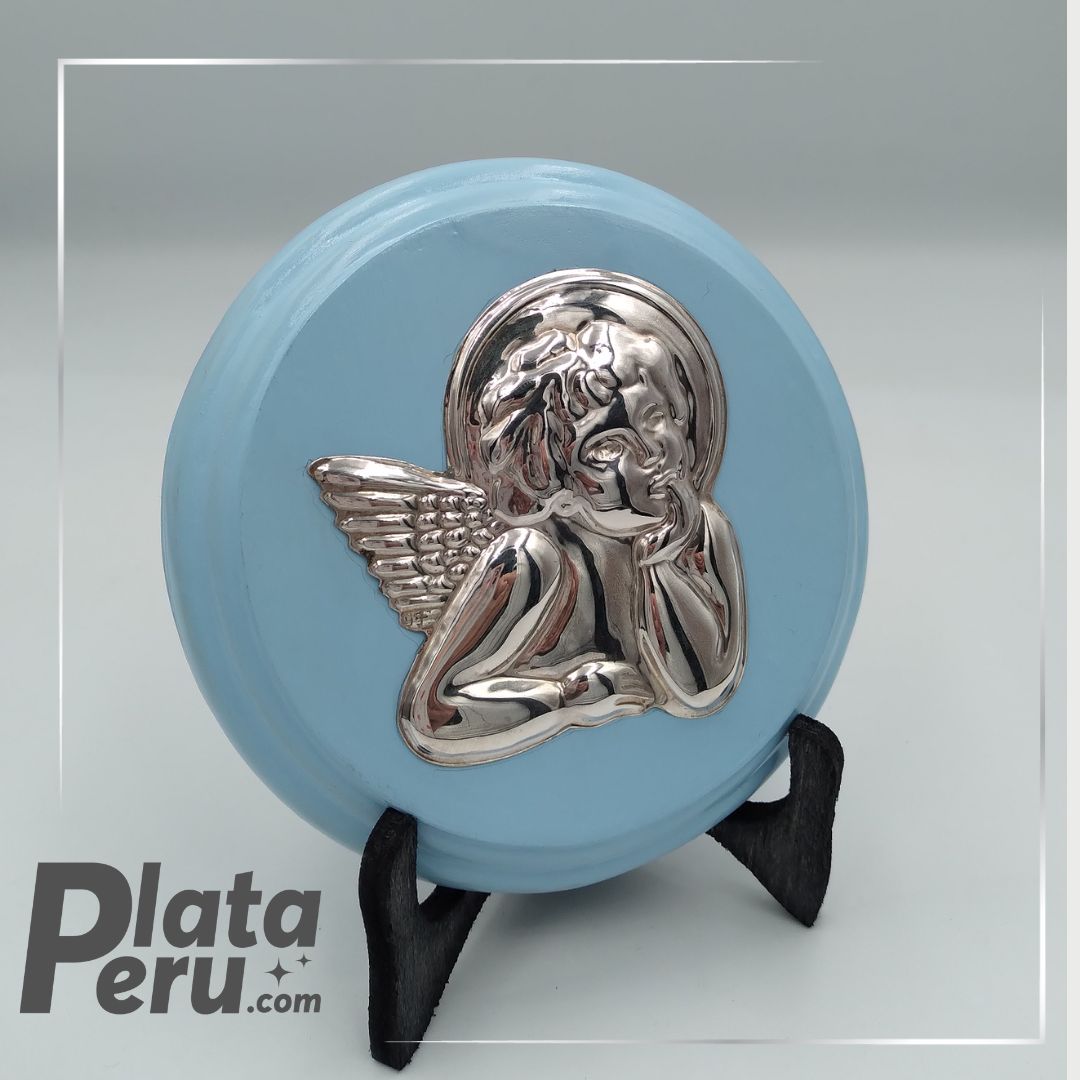 Marco del Angel de la guarda en plata 925, base de madera, para colgar.