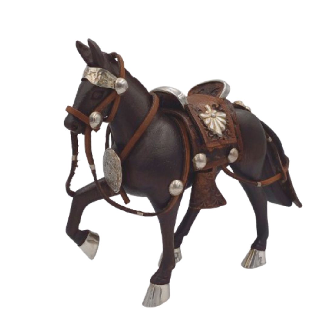 Caballo de paso de madera tallada con aplicaciones en plata 925 ley. Montura de cuero repujado.