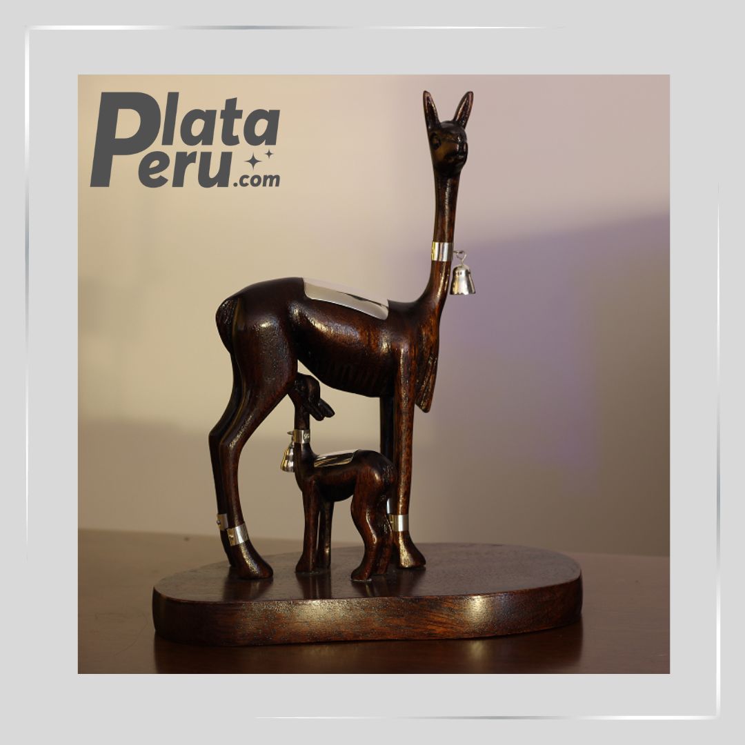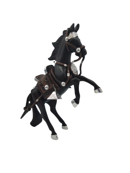 Caballo tallado en madera caoba con aplicaciones de plata 925, montura de cuero. Alt 20 cm.