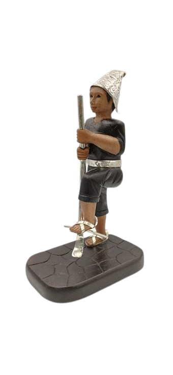 Campesino labrando la tierra, tallado en madera con aplicaciones de plata 925.
