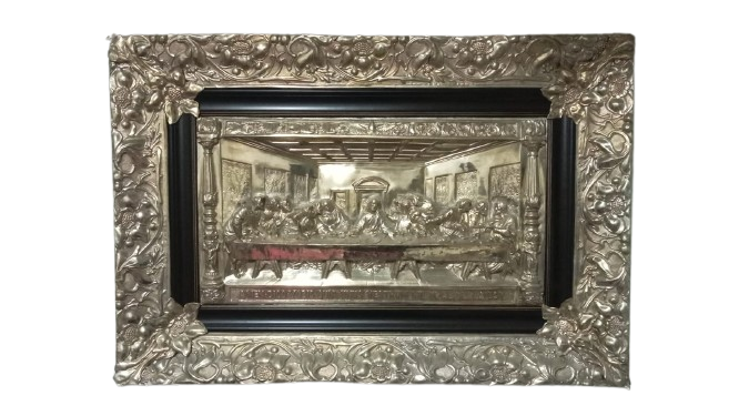 Precioso cuadro de la última cena con base de marco de madera, esquineros de hojas repujadas.