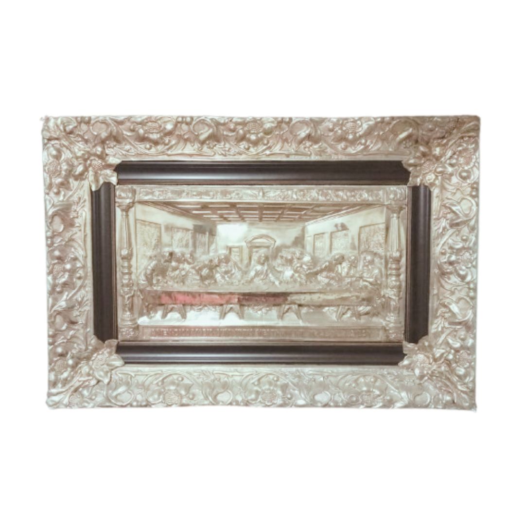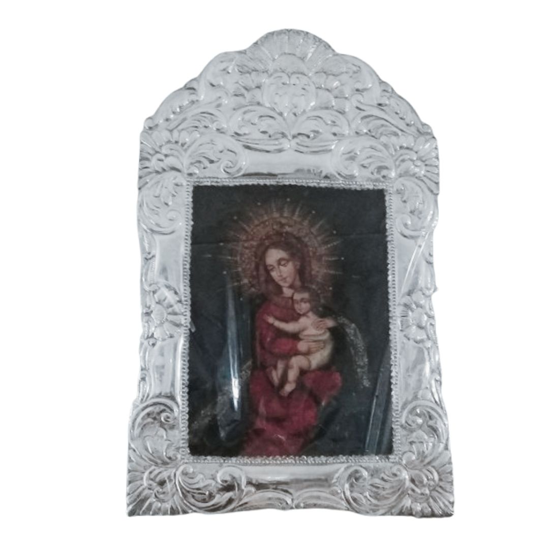 Marco colonial con corona repujado 100% a mano, con pintura cuzqueña.